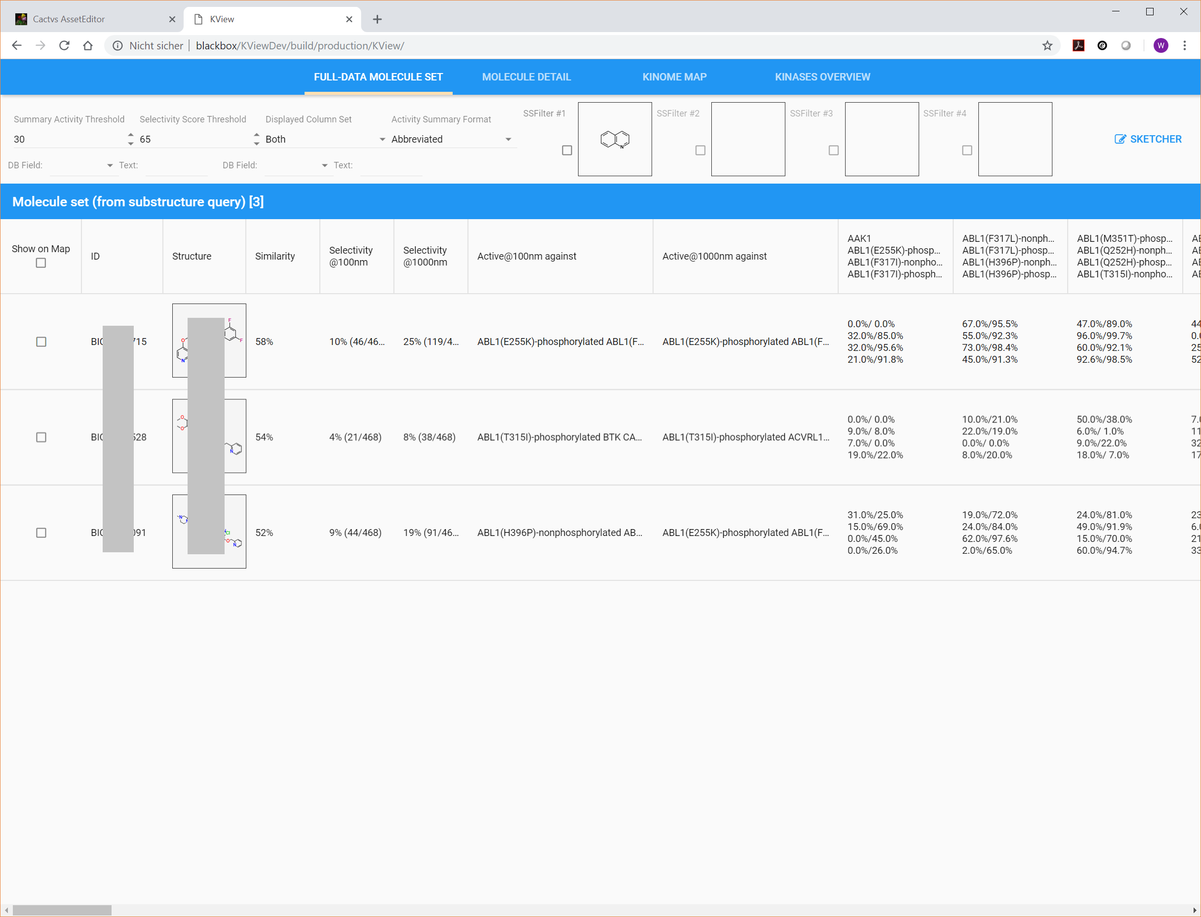 • A custom backend FCGI script to translate user commands issued on the Web interface into database queries, and to send back data tables, structure renderings and Kinome tree markup.