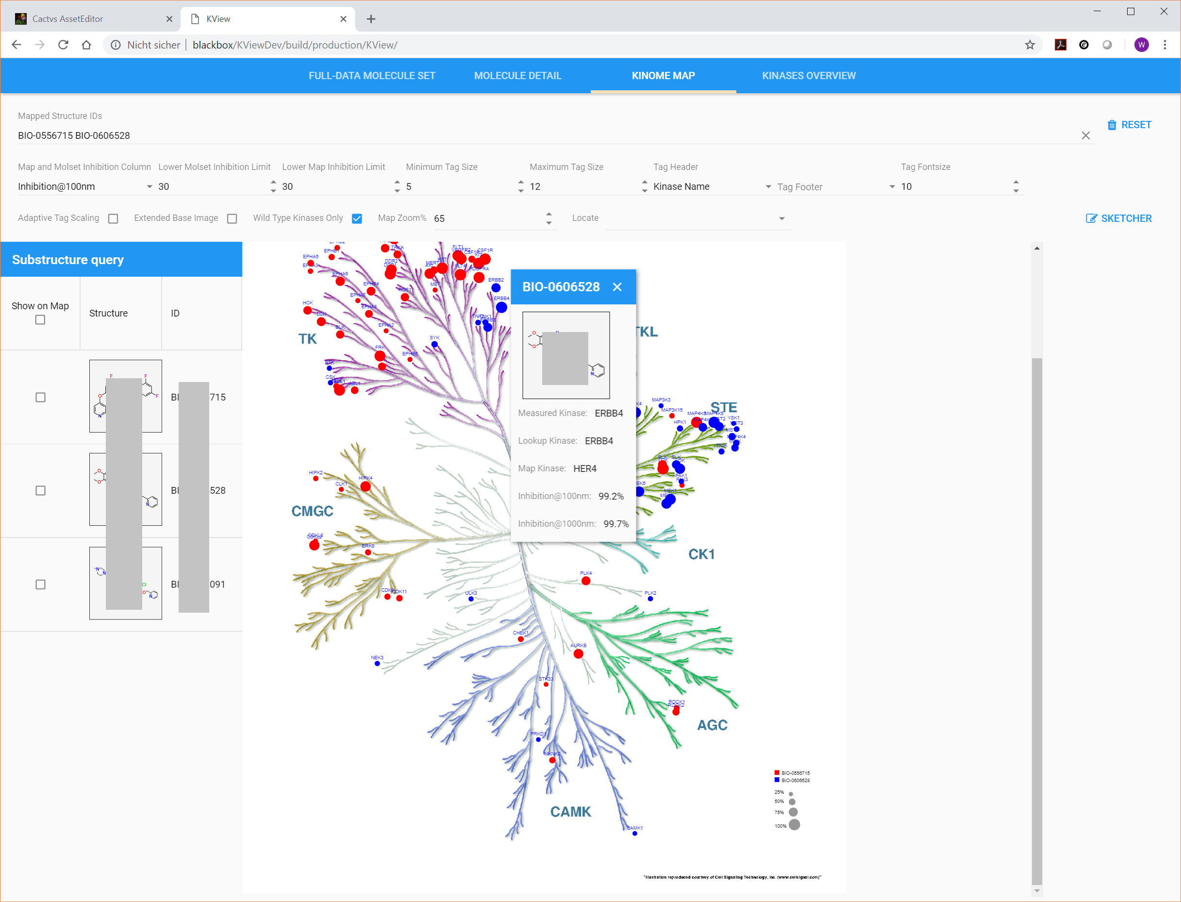 Below are screenshots from a recently completed customer project. Our client desired an interactive Web-based Kinome viewer, with a collection of custom features and data display possibilities which were not available in turnkey commercial solutions. The software was required to seamlessly fit into the existing client software environment - the Linux server with a set OS version, the specific PostgreSQL database system, the Web server the format of the input data and required URL styles to open the application Web pages in specific views from other client applications were all defined as not adjustable. Nevertheless, we succeeded to deliver a solution under these constraints.